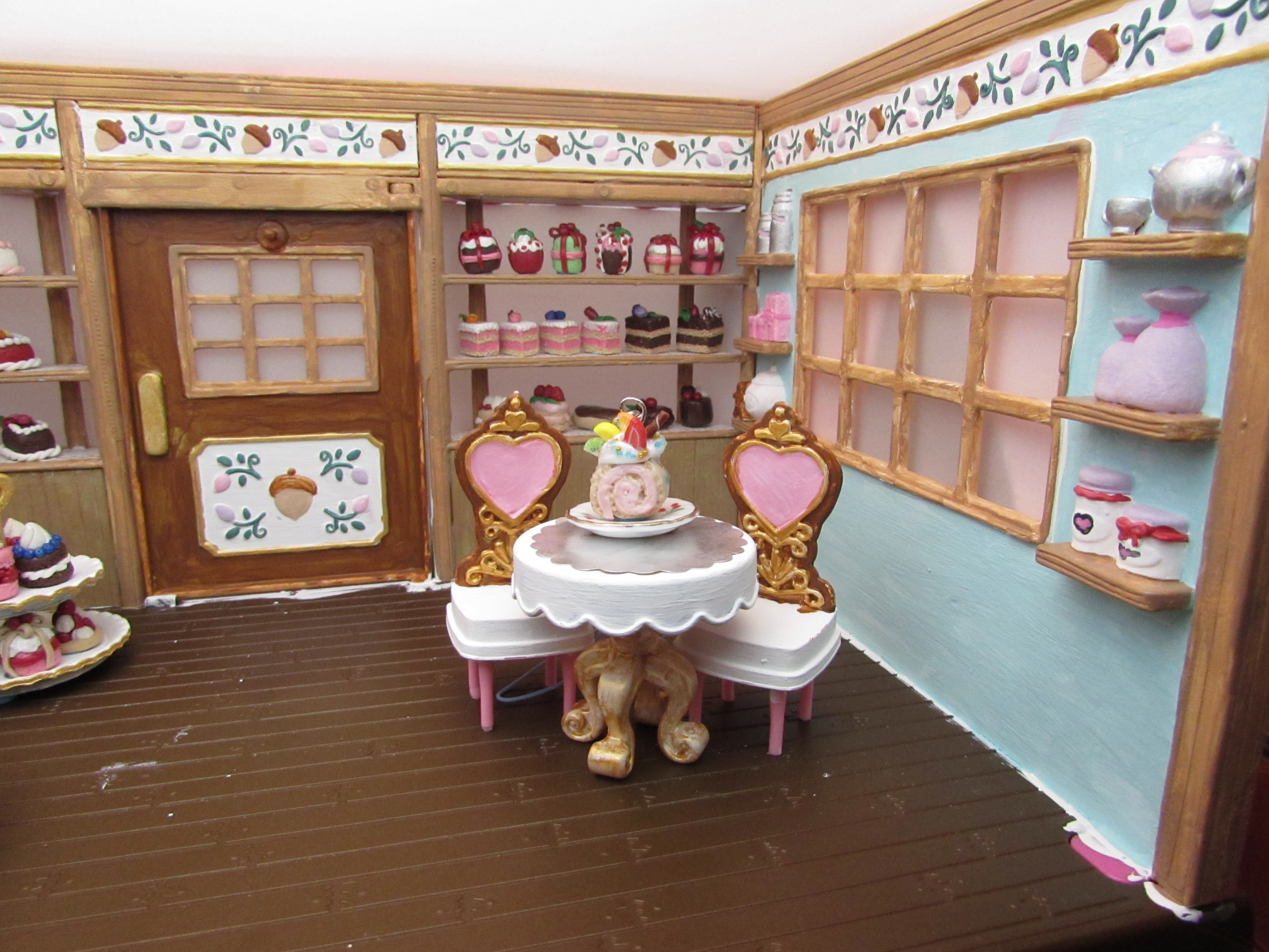 The third picture has a tea set with a cake roll to the left, and the first picture features the same one. The cake is a cell phone charm, as you can see with the string in the tea cup. :p Anyways, the whole point of this major project is making a nice scene to display the little cake charms, particularly to sell them. I am not sure if it looks better with the tea set (might be washed out with too much white), or alone on the table for two. Oh, the major decisions in life.